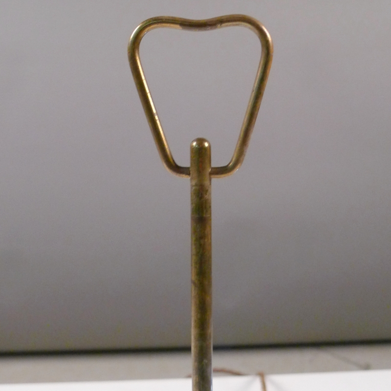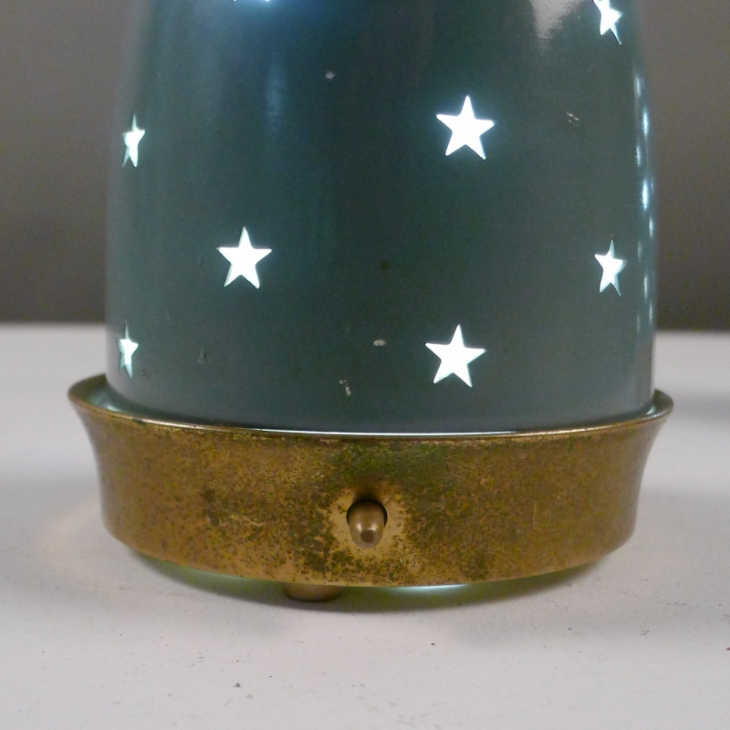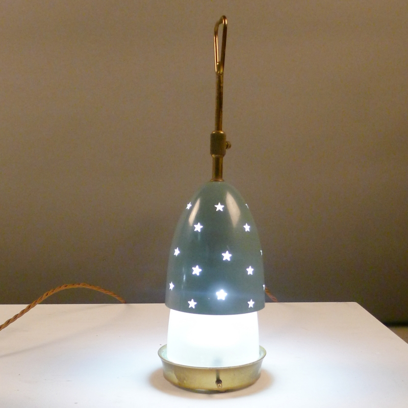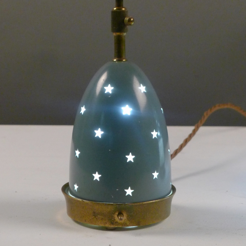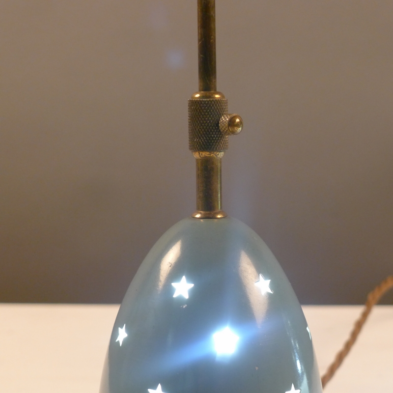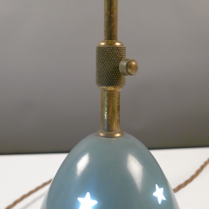 brass framework holds a pierced duck-egg blue enamelled shade which is adjustable vertically to reveal the opaque glass shade beneath
