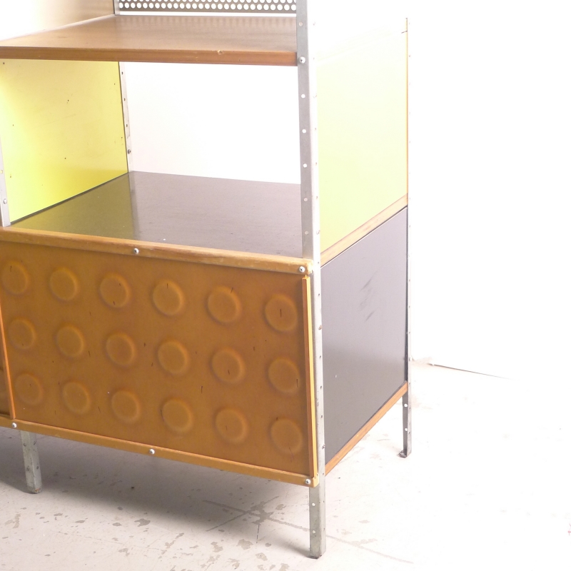 The 400 series consisted of units four levels high, all featuring a two-bay width. Each section could be configured with open fronts or backs using wire cross-bracing, drawers, sliding elements, or panels finished in either brightly coloured or neutral laminates, as well as natural plywood.