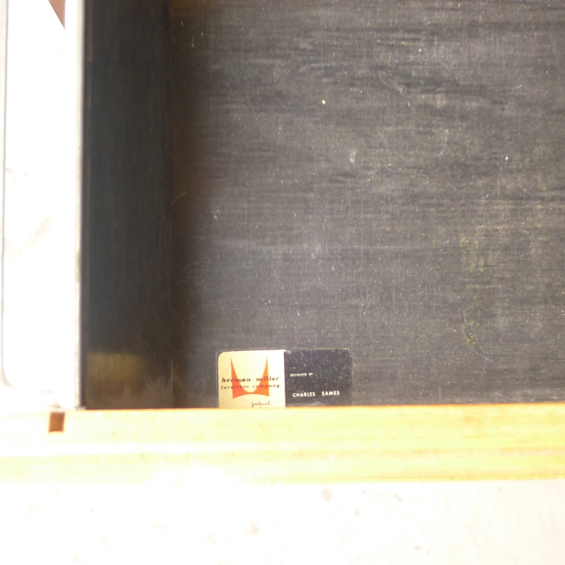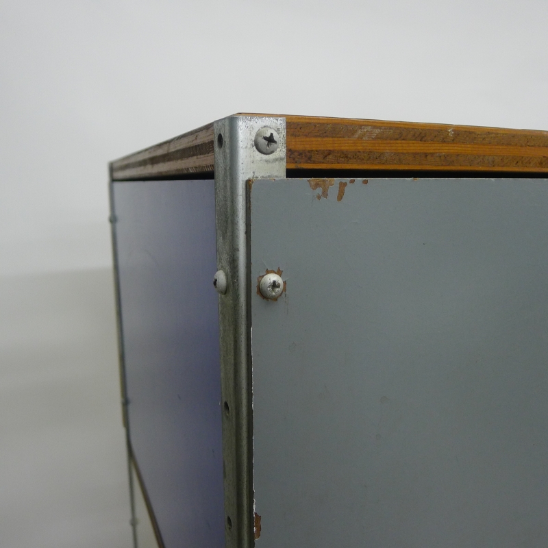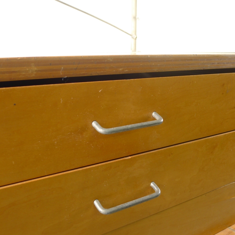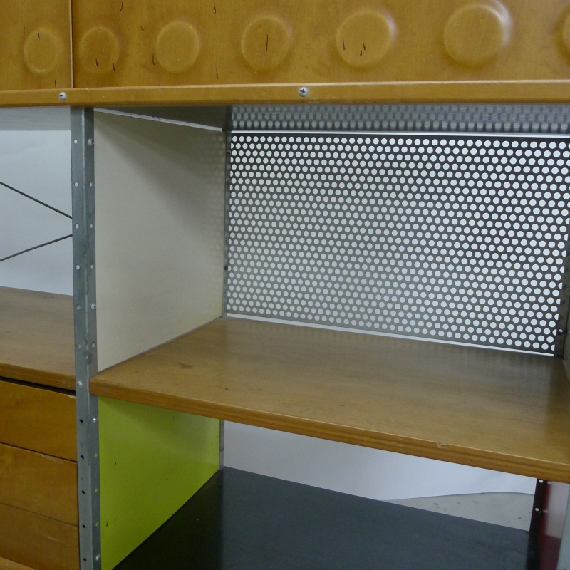 All models were constructed with chrome-plated steel angles, legs, and cross supports. This example is an early version with six legs; around 1952, the design was revised to incorporate four more centrally positioned legs. The shelving and drawers are finished in birch and walnut veneer, complemented by baked enamel panels in various colours—including red, blue, and yellow—and “dimple” patterned sliding doors in natural birch veneer.