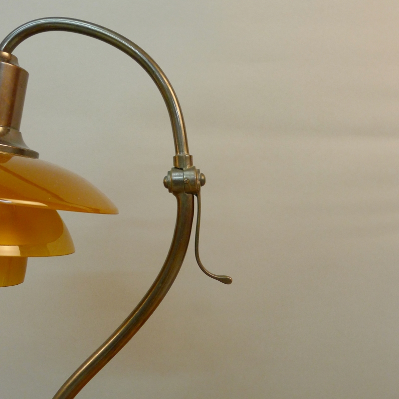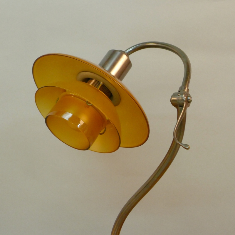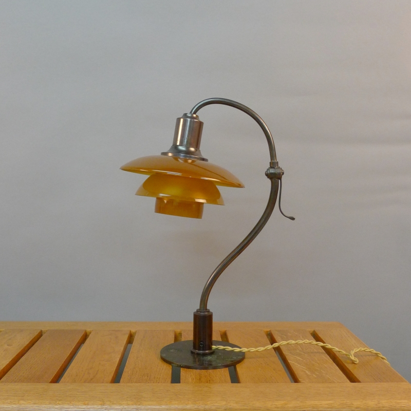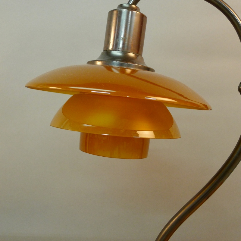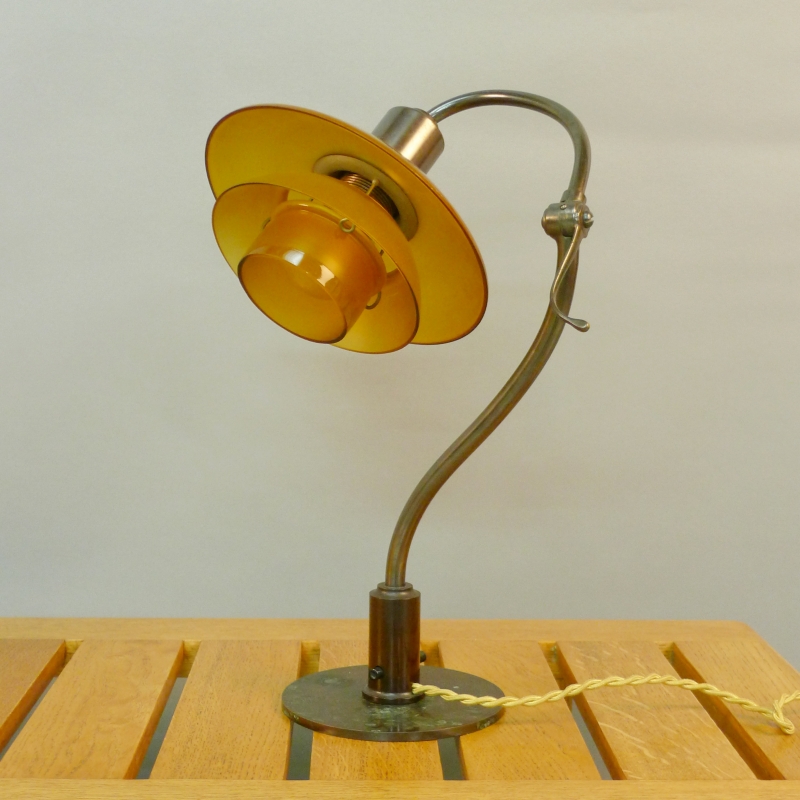 Three graduated amber coloured glass shades, the patinated brass base stamped “Patented” and “PH-2”, with Bakelite switch house.