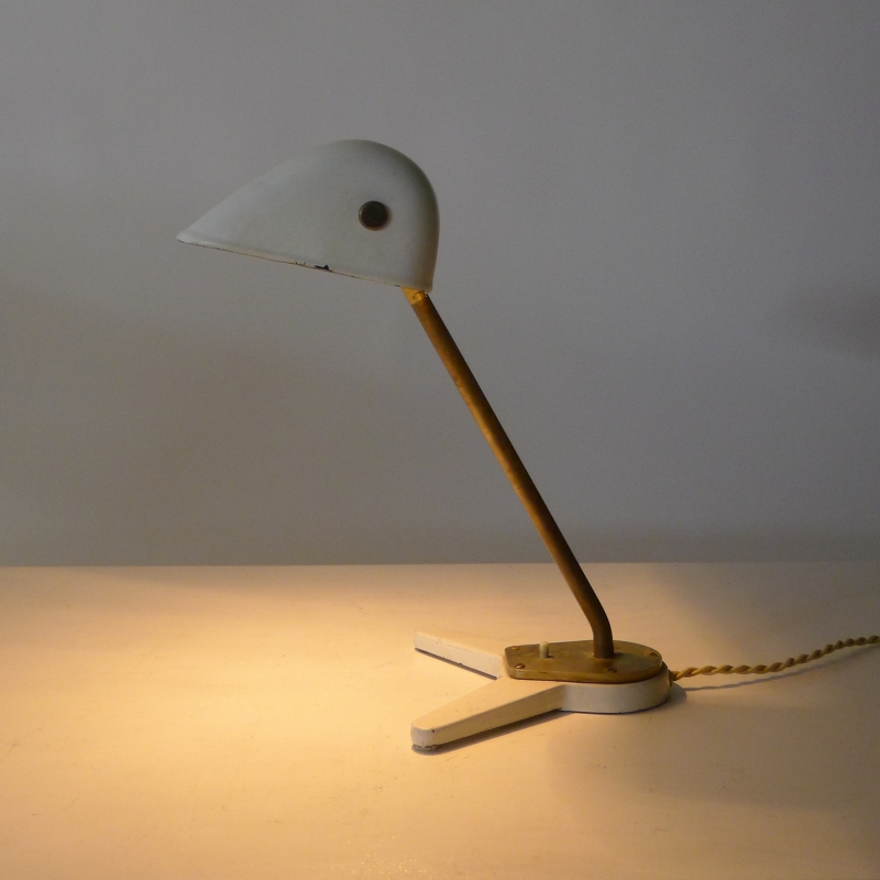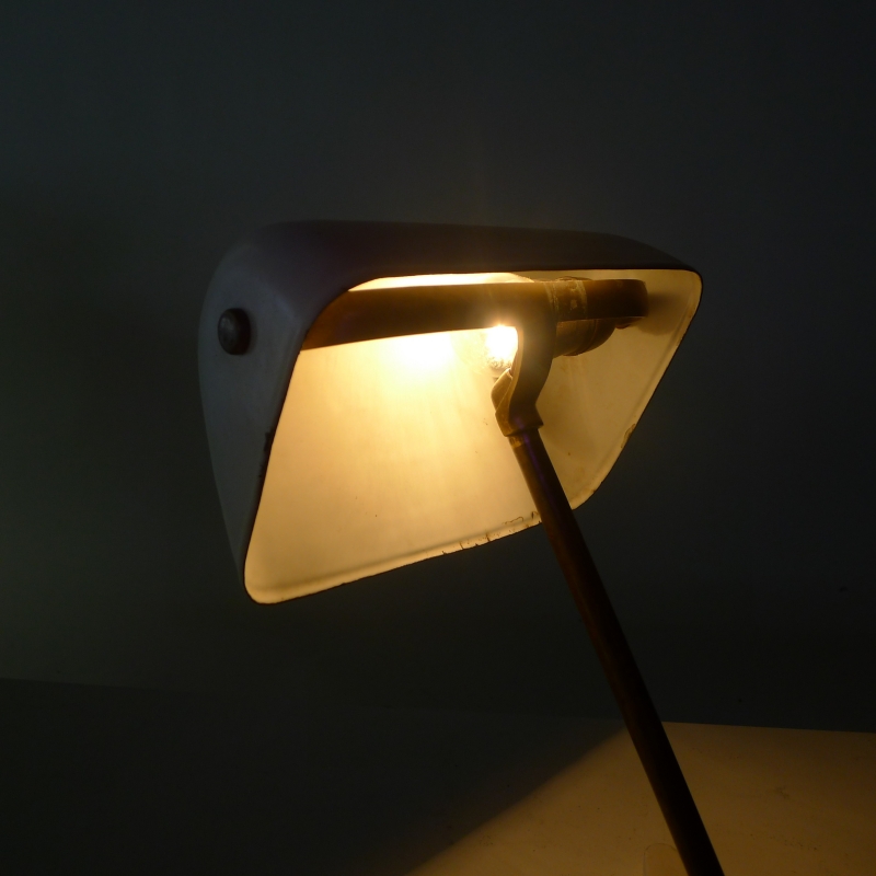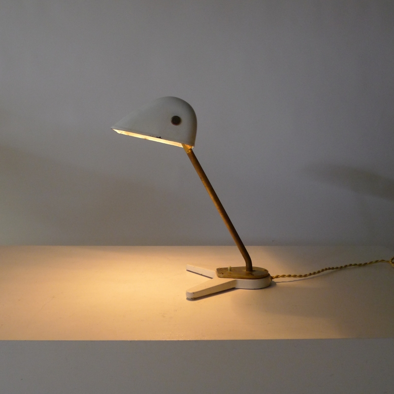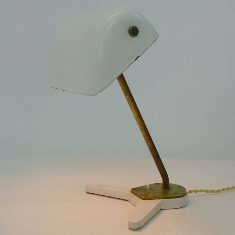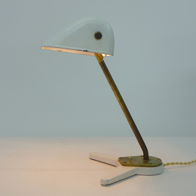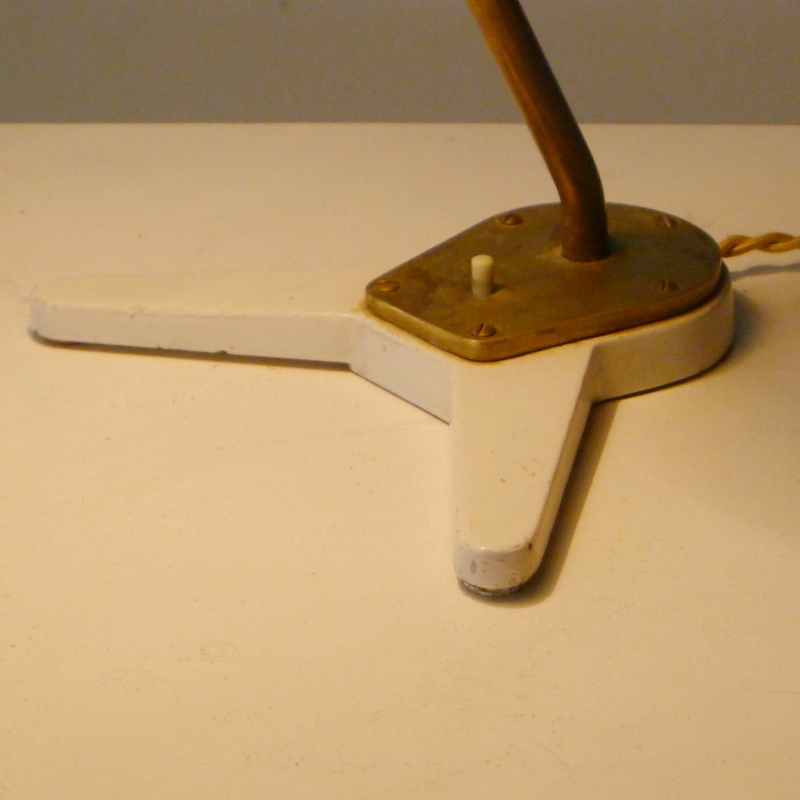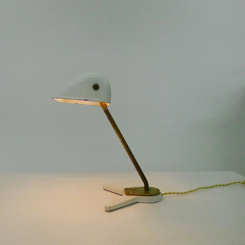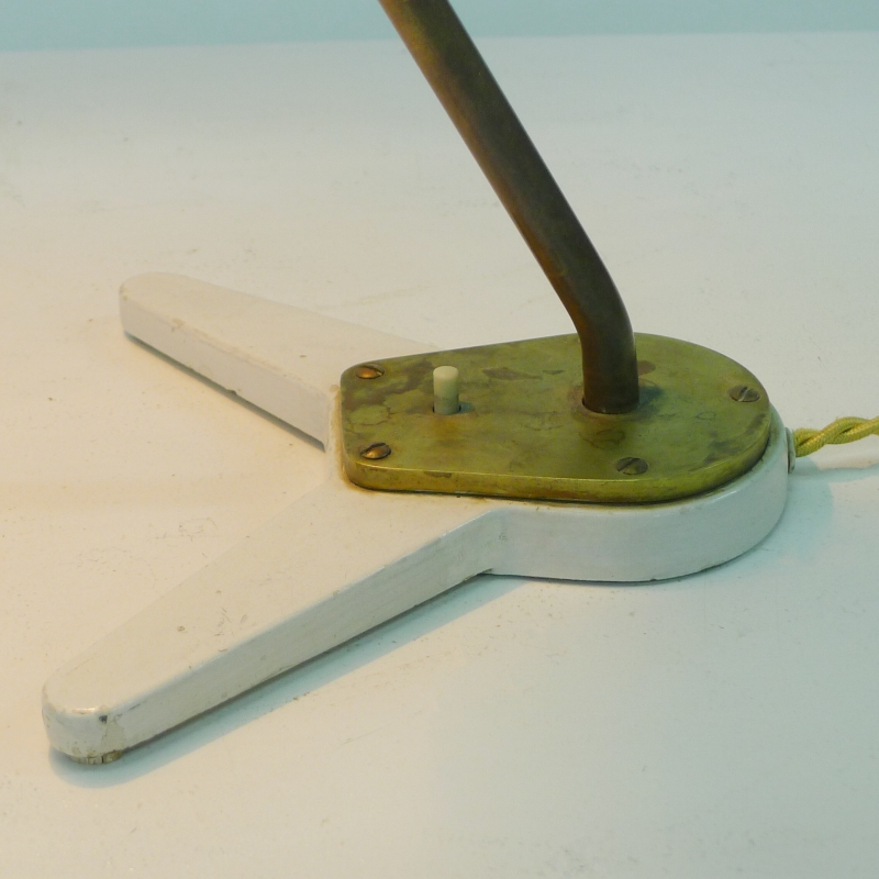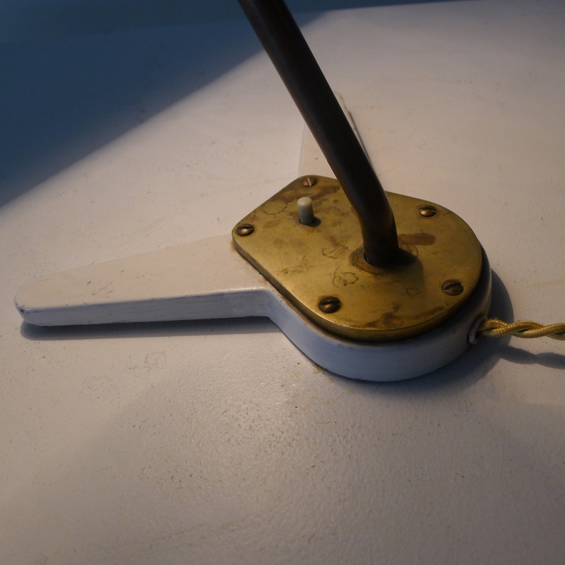 This very rare desk lamp has a white lacquered adjustable shade on an adjustable brass stem and foot mount with bakelite push button switch