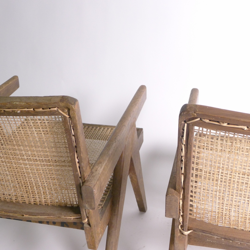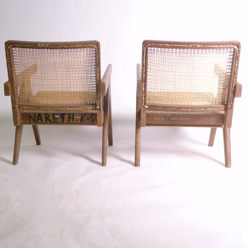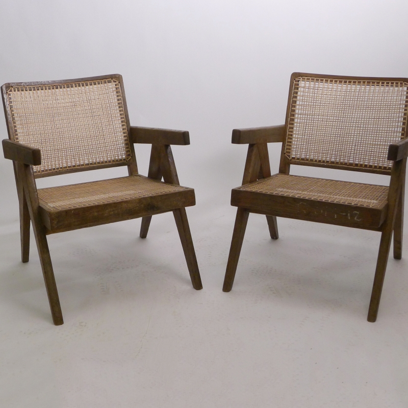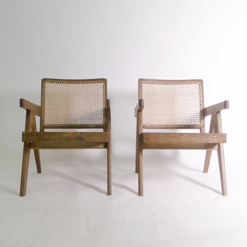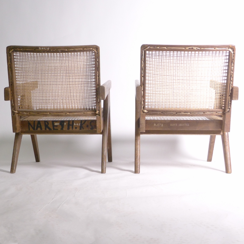 These chairs are authentic 1950s pieces from Chandigarh. They have been lightly restored to original condition, and the cane replaced.