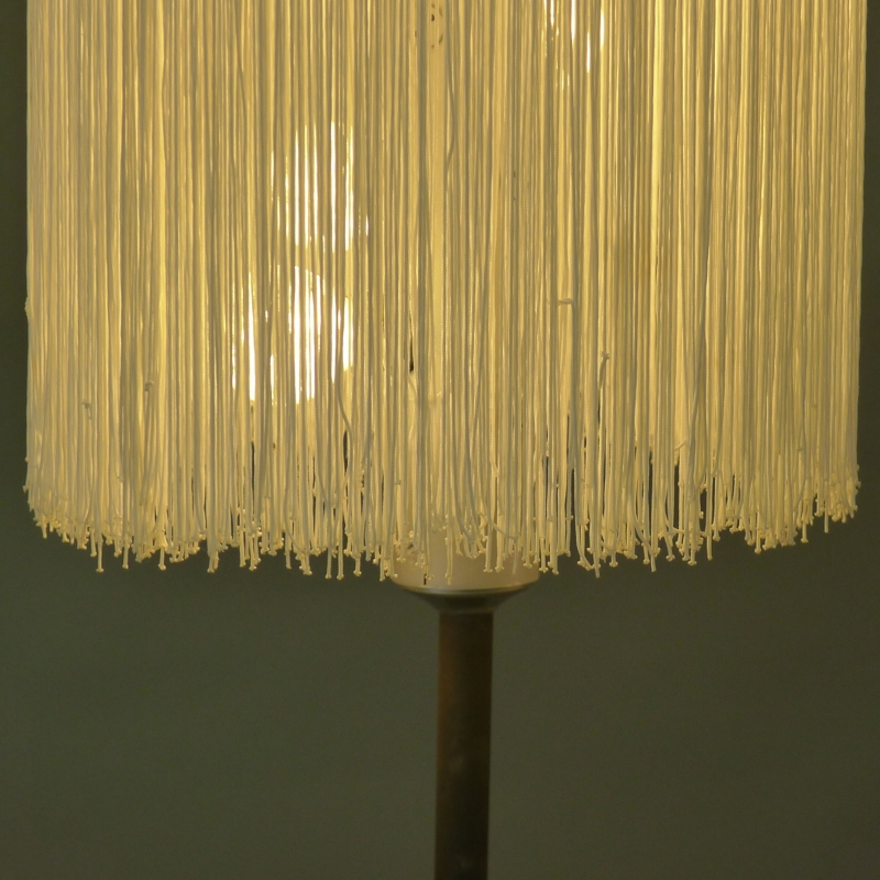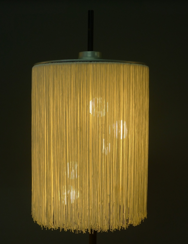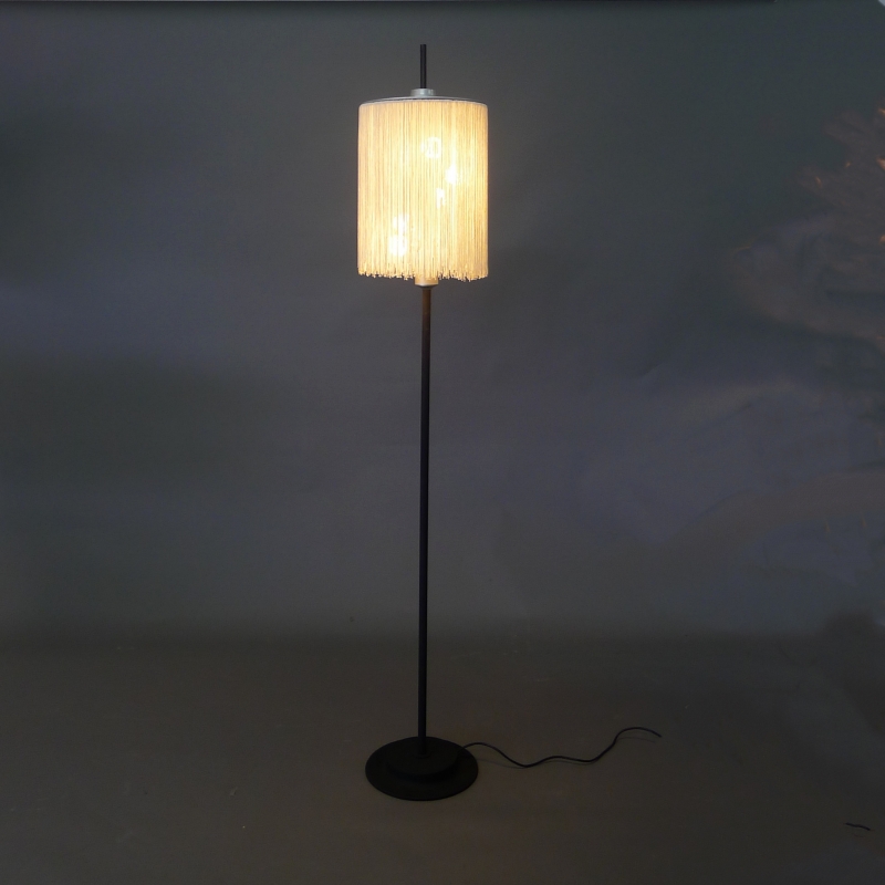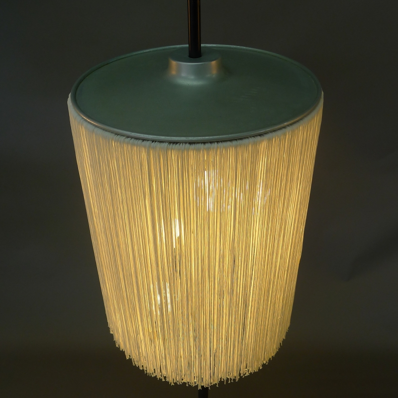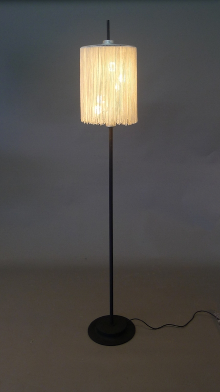 black enamelled iron foot and stem, aluminium bulb holder and top plate, holding in place a shade made of strands of white silky fabric suspended from a wire ring