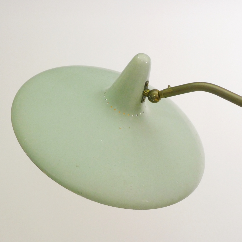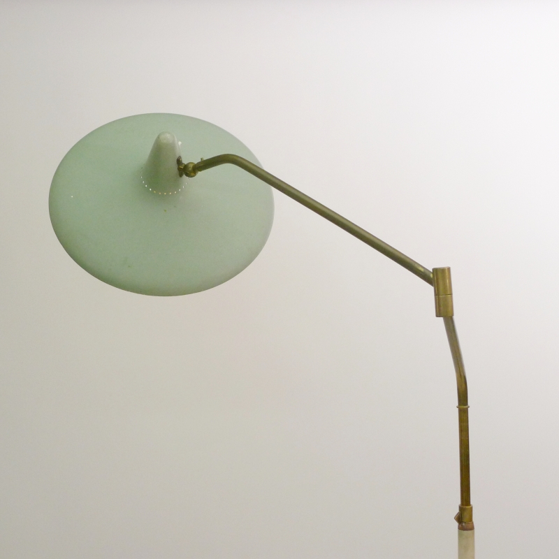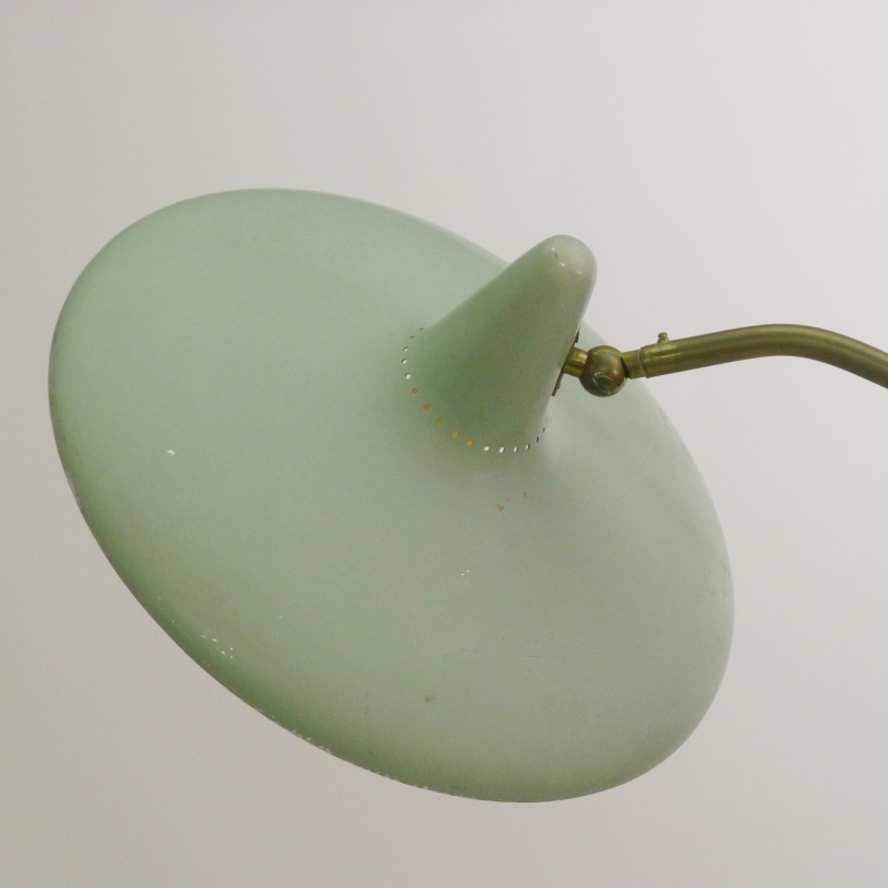 Seafoam green enamelled aluminium shade with feature perforations allowing the light to shine through the top, on ball jointed neck so the shade articulates to point where required. The telescopic white enamelled steel and brass column transform the height of the light between 1.75cm and 2m high, on circular white marble base. Shade diameter 39cm.