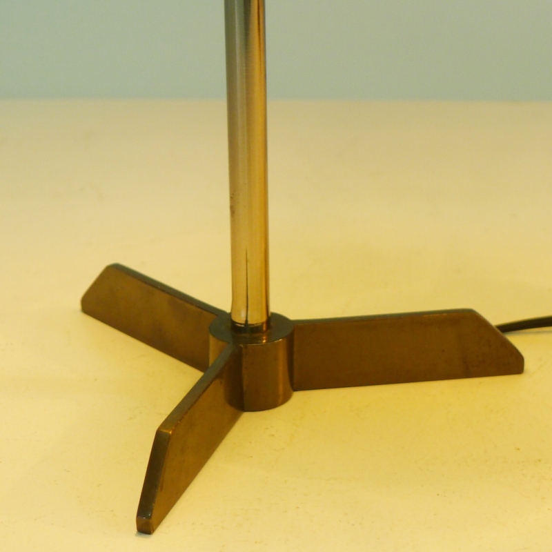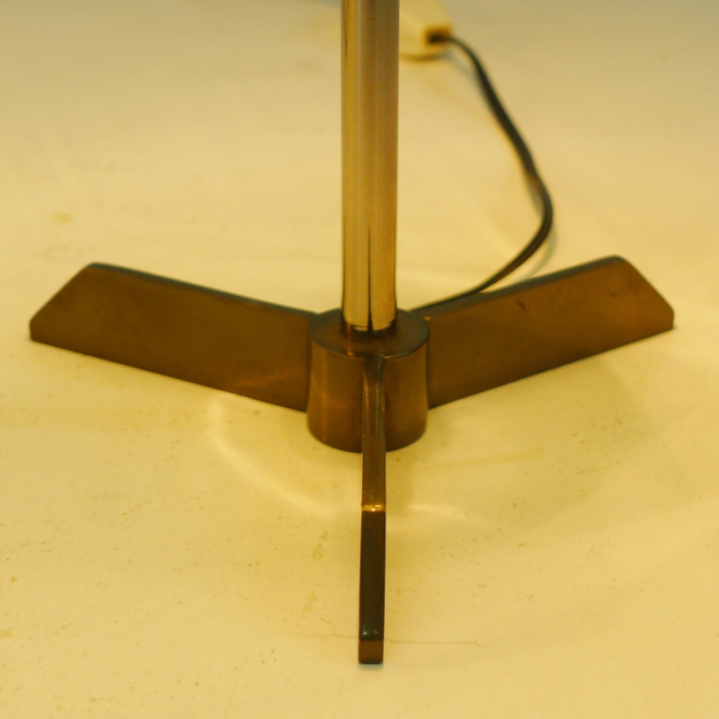Buttercup yellow acrylic shades on brass supports, each raised on a nickel plated brass tripod stand