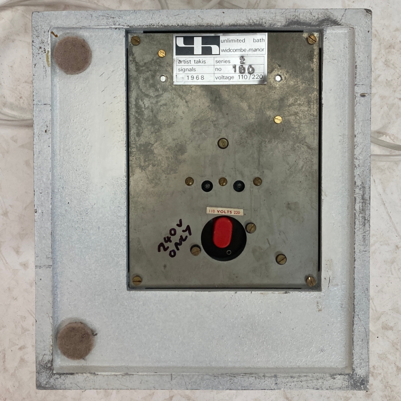 Metal publisher’s label to underside for Unlimited, a company aimed at making art more accessible, which was based at Widcombe Manor in Bath from 1967 to 1969. The company, founded by Jeremy Fry, used the manor’s basement as its operational hub. Unlimited collaborated with various artists, including Takis, to produce and distribute artworks in multiples.