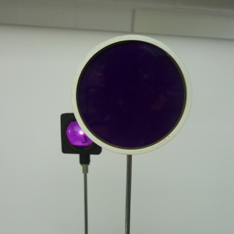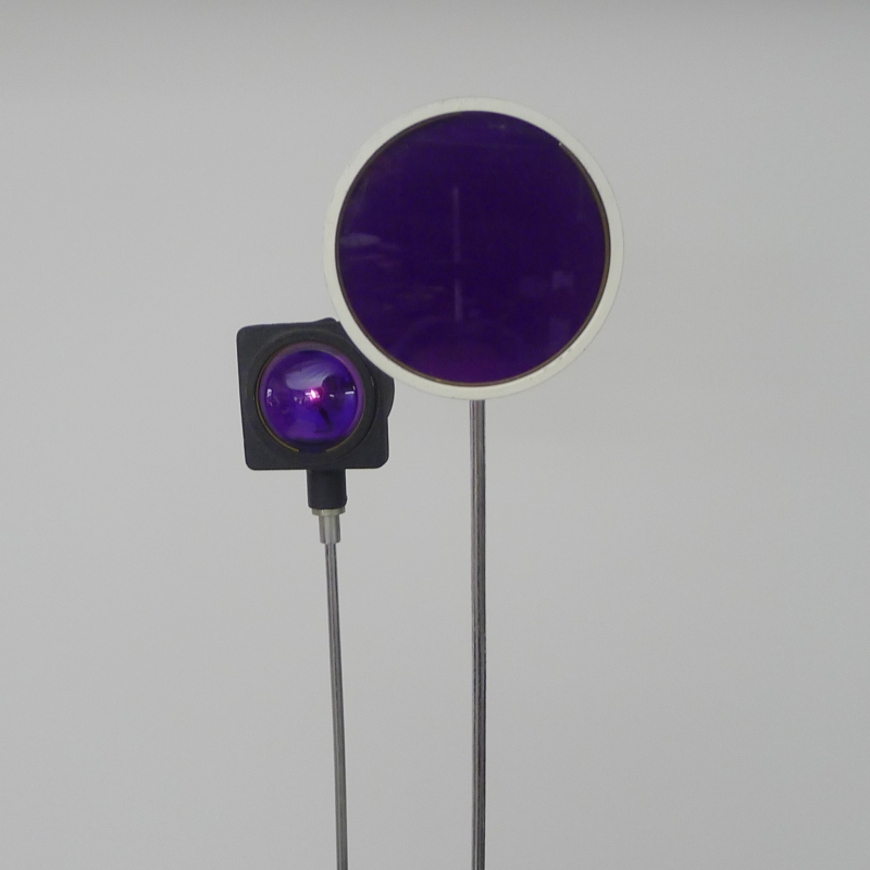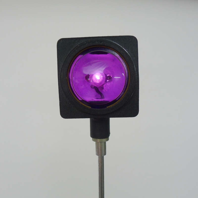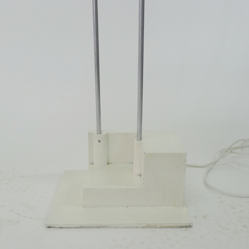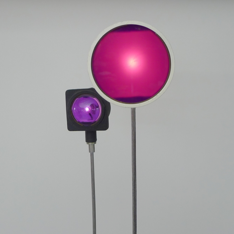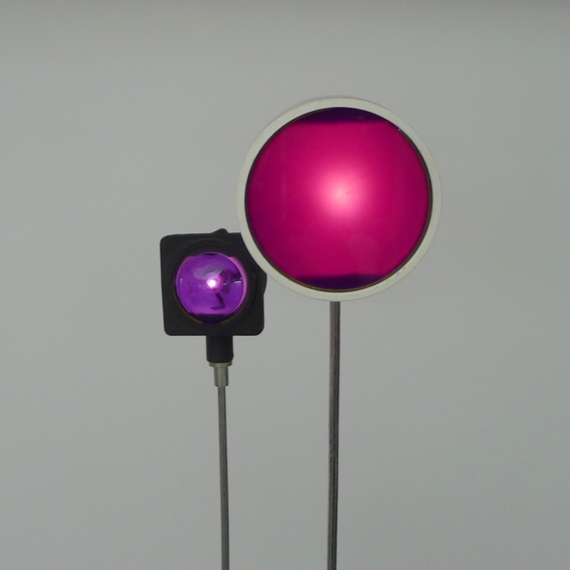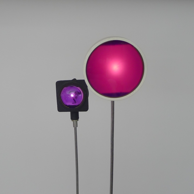 painted and lacquered aluminium base, two chrome plated steel telescopic supports, square and circular lights with violet and magenta acrylic diffusers. When switched on, the lights flash intermittently in a mesmerising sequence.