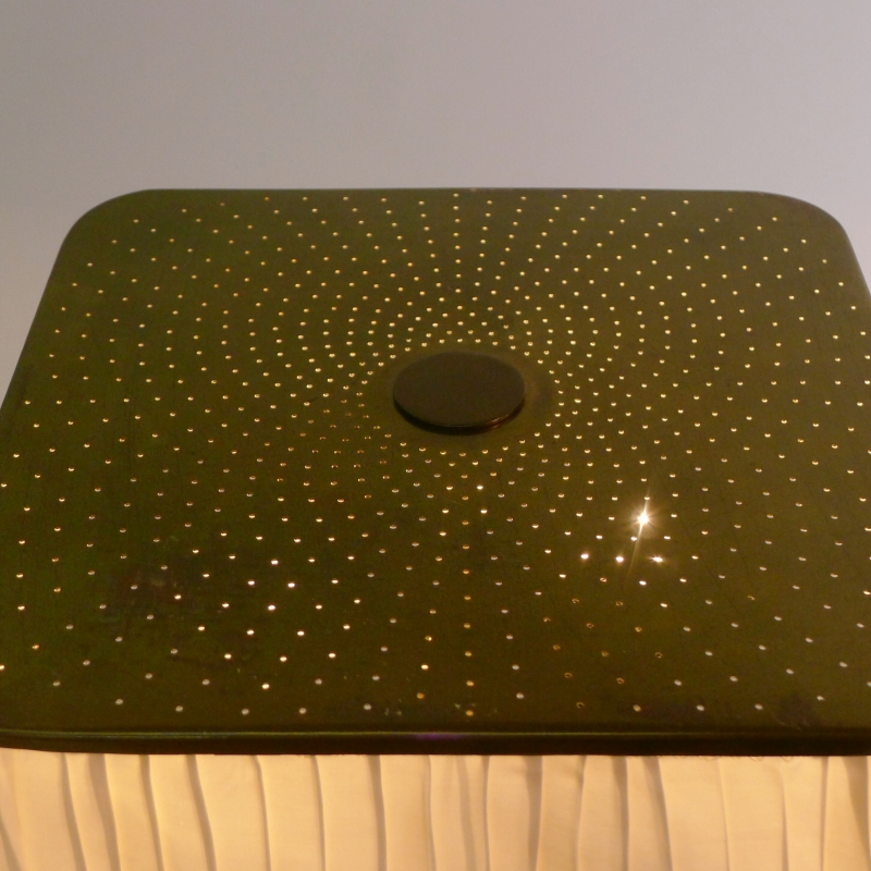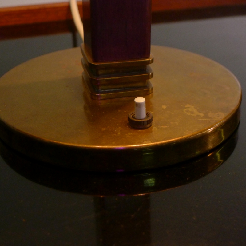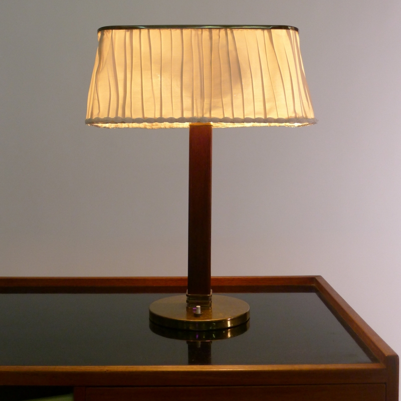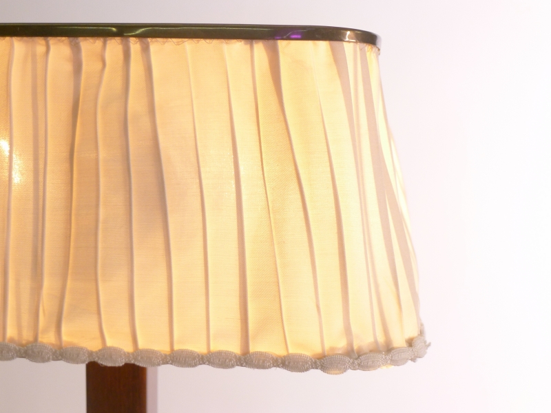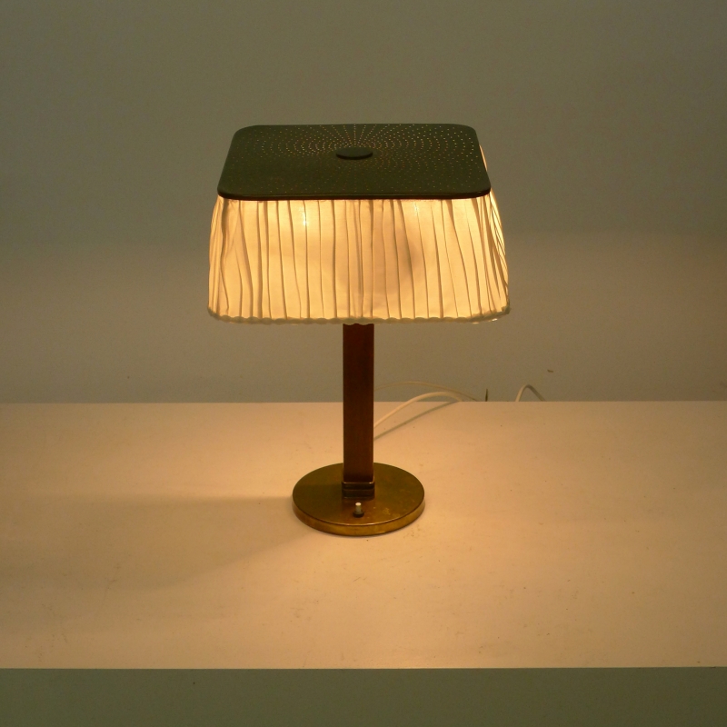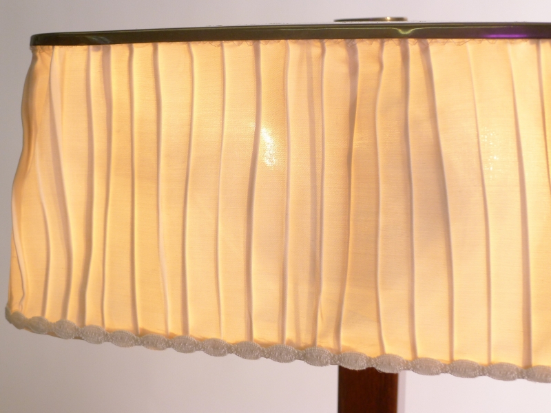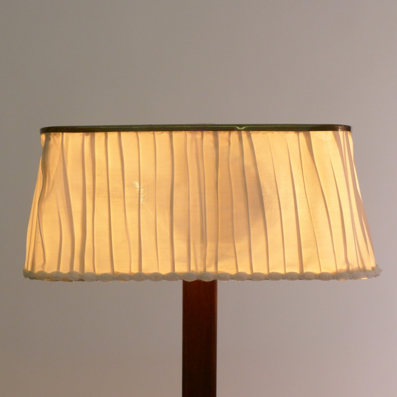 Hard wood square stem with circular brass base and push button, the original pleated silk shade with brass top perforated in the fibonacci sequence to allow light to filter through.