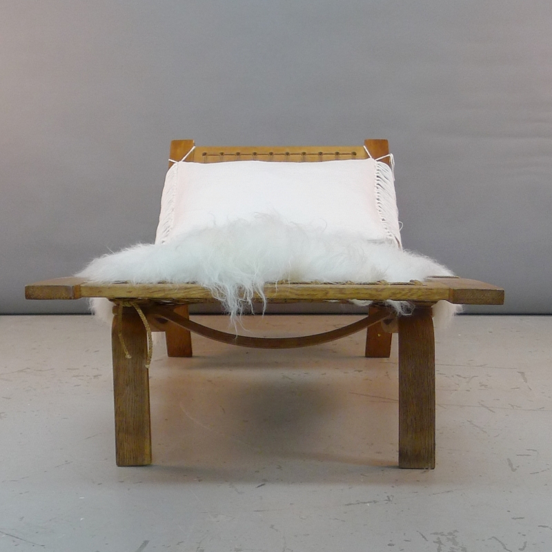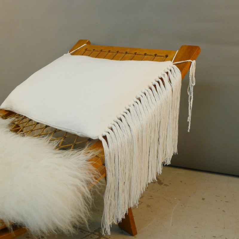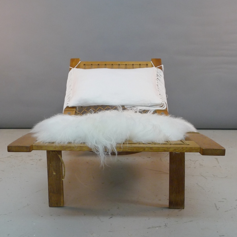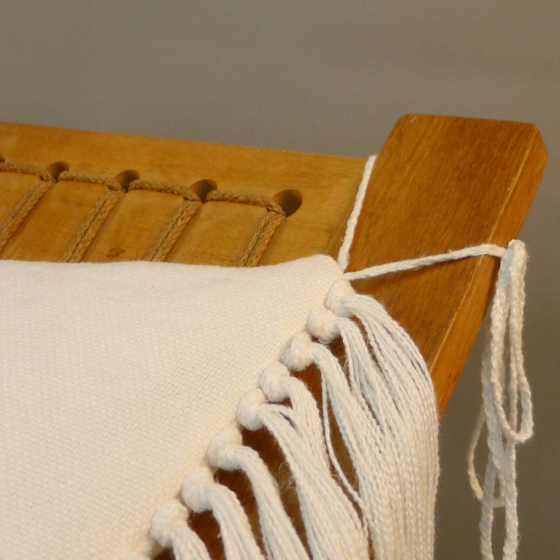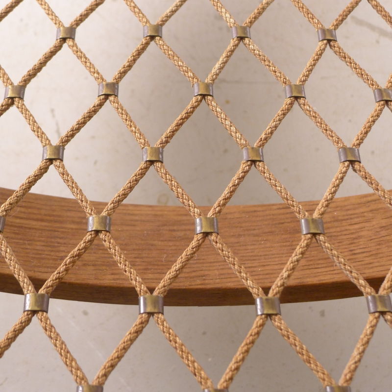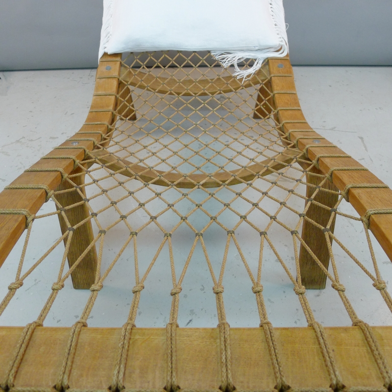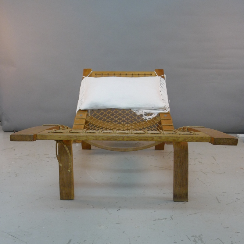 oak frame with flagline seat, the rope secured with copper cleats, complete with light linen upholstered fringed cushion