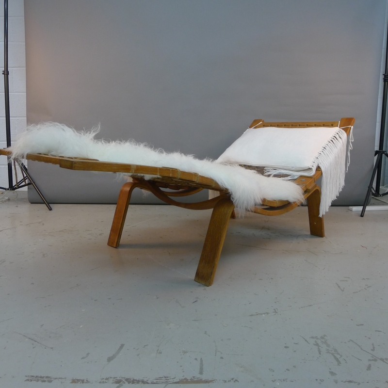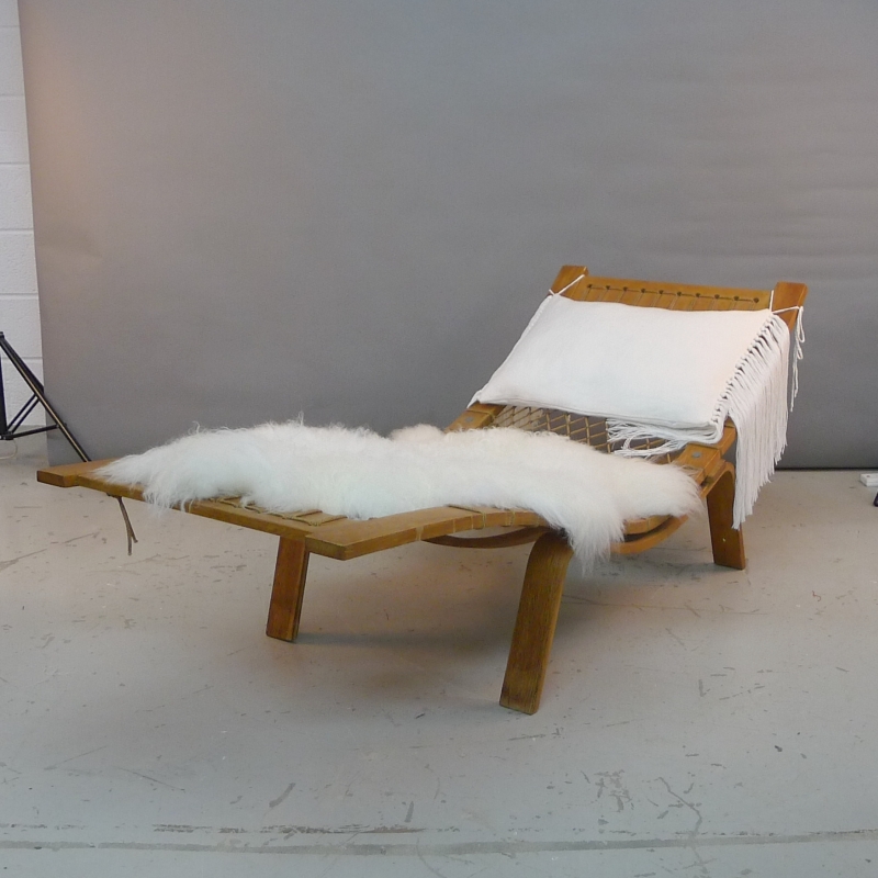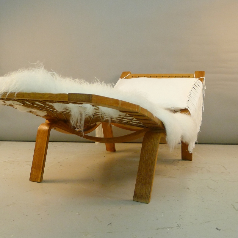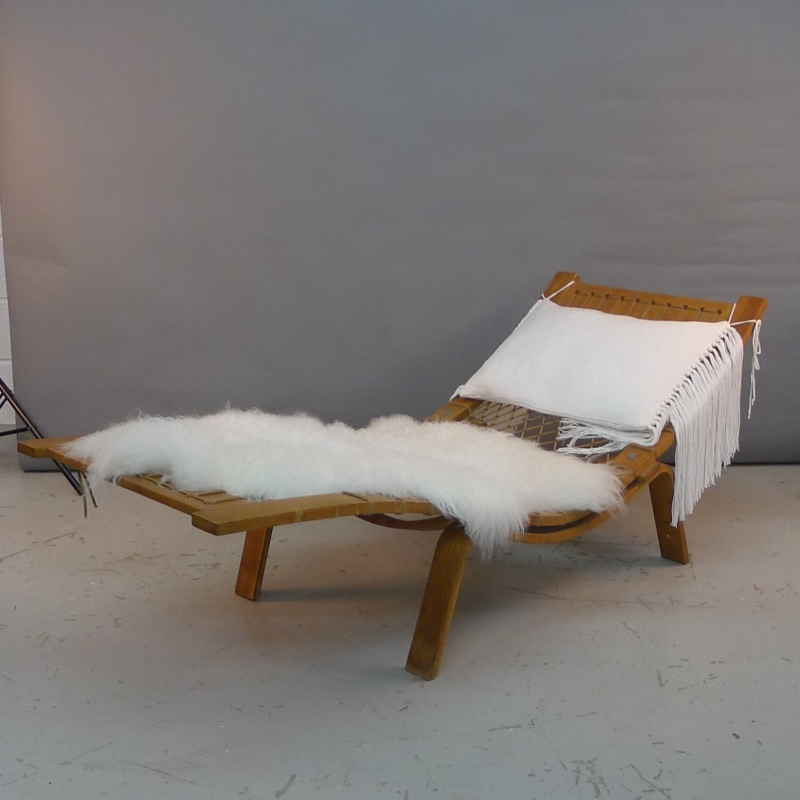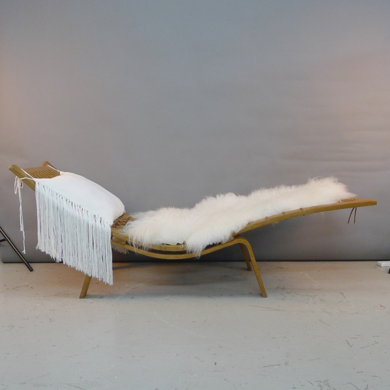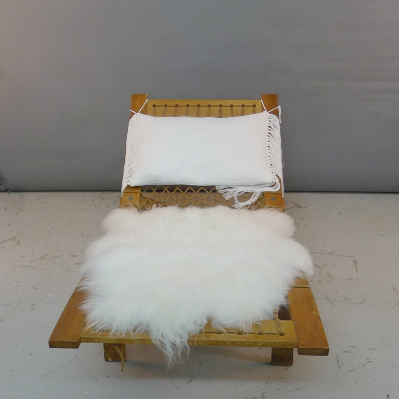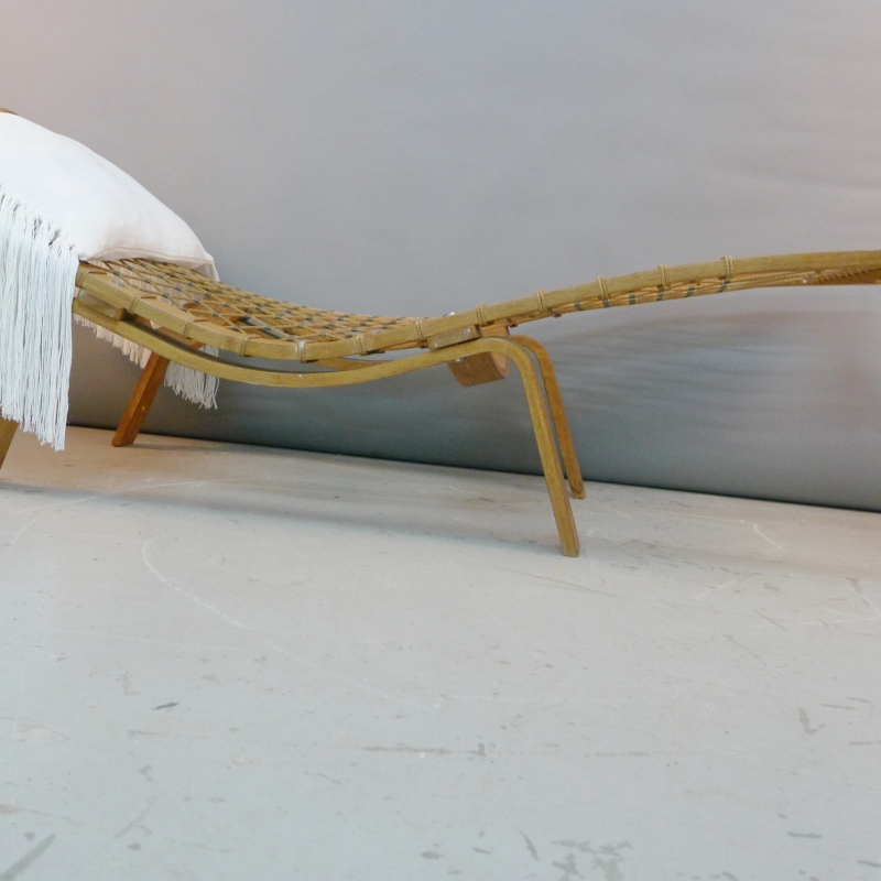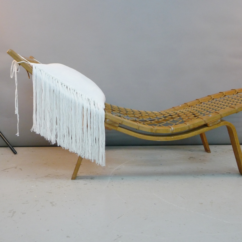 oak frame with flagline seat, the rope secured with copper cleats, complete with light linen upholstered fringed cushion