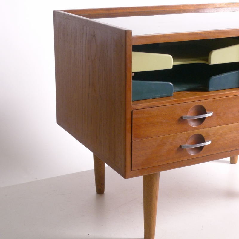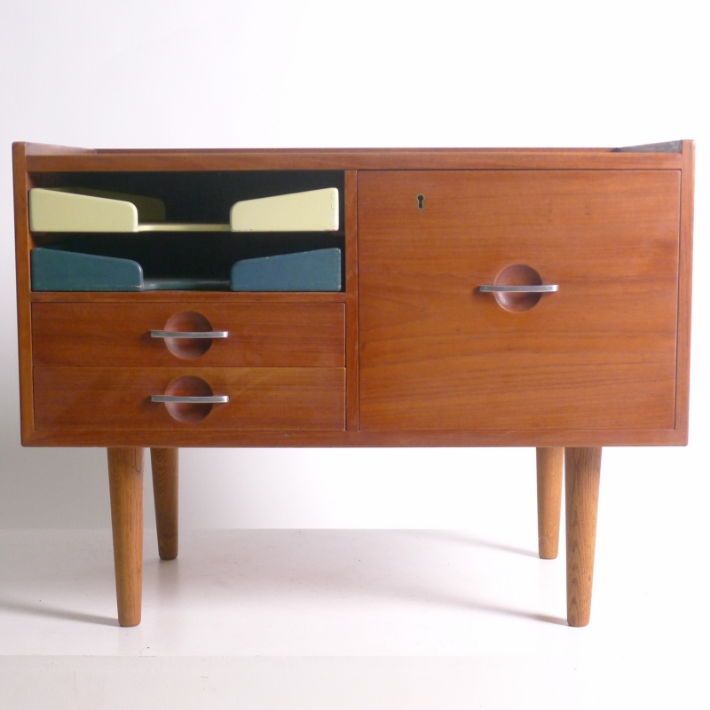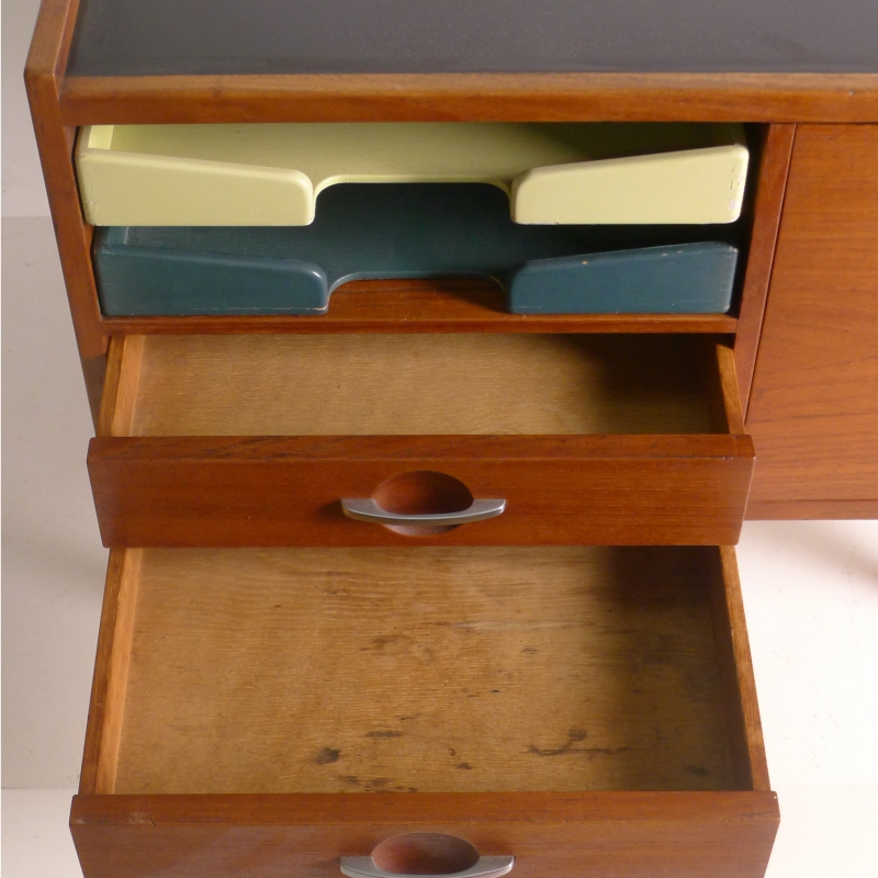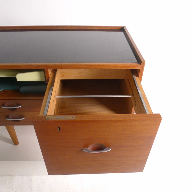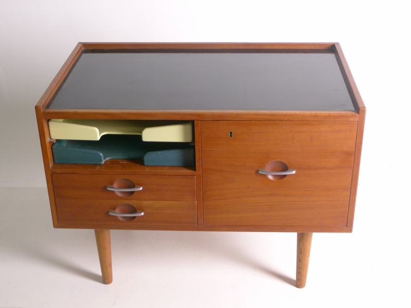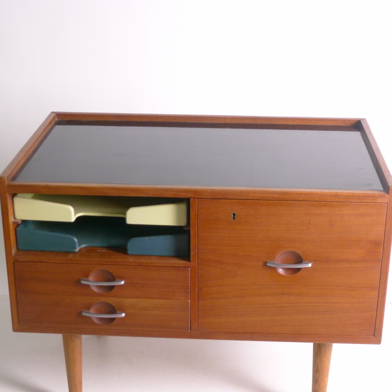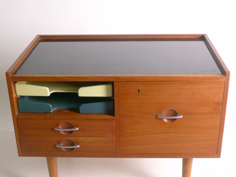 teak cabinet in with black laminate top on turned oak dowel legs, fitted two painted wood paper trays to the left side above two drawers and a larger hanging file drawer to right side, steel recessed handles
